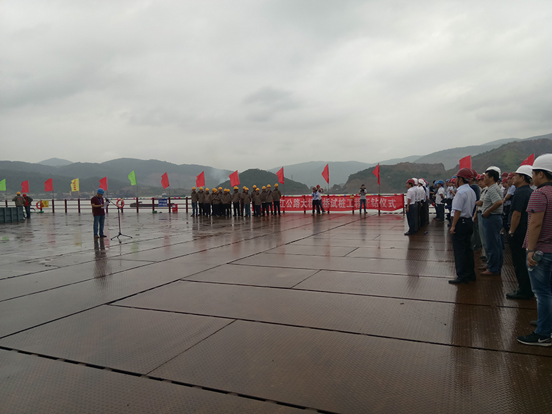 随着现场指挥的一声令下,武穴长江公路大桥主桥试桩工程12#墩6#桩正式动工开钻。本项目选择12#墩6#桩作为试桩,试桩长度55m,直径2m,钢护筒内径2.3m。本次试桩工程将为主桥桩基础工程提供第一手的施工资料,为后续的设计、施工、检测等环节提供技术参数。