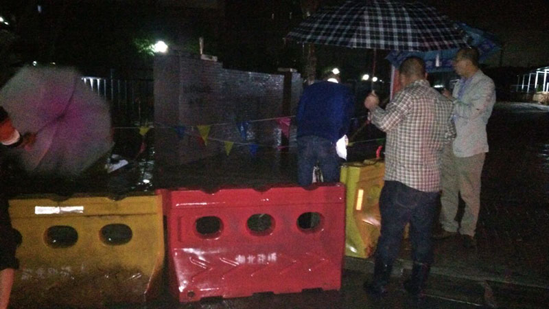 4月8日晚8点半左右,第二轮暴雨来袭。花城家园兰园外墙的排水渠排水不畅,大面积的雨水漫延到还建房四号路,加上排水明渠周围无牢靠的防护设施,周边又有几家餐馆,排除安全隐患刻不容缓。花投公司周育堂和董勇等同志迅速赶往现场,坐镇指挥。花山市政项目排水巡查组接到消息,迅速托运一车水码赶赴现场,对明渠周围进行打围,并在当地群众的协助下,向打围好的水码内灌水。在风雨中,领导靠前指挥,与排水巡查组并肩鏖战到晚上10点半左右,一切安全措施落实到位之后,方才离开。
