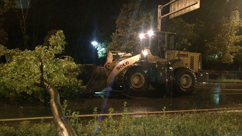 裹着被雨水和汗水浸湿的衣服,拖着疲惫的身体,项目部巡查组终于踏上了回程的路途。途经花城大道时,发现中央分隔带有一棵大樟树被大风刮倒,横卧在主道上,交通受阻,项目巡查组迅速联系装载机师傅,将大树移至中央分隔带,保证了路面的畅通和安全。