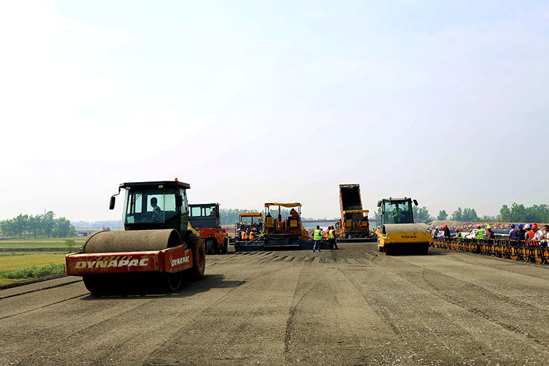 5月2日,孝感段三标水稳试验段开始摊铺,此次水稳试验段里程为ZK122+340--ZK122+580处,全长240米。本次试验段为加宽路段,采用两台天津鼎盛WTD9001和一台可伸缩福格勒1900摊铺机进行梯队摊铺,采用先胶轮后单钢轮交替碾压的组合方式。上午9时,当第一车水稳混合料缓缓倒入摊铺机料斗时,标志着我项目成功完成工序的转换;也标志着我项目全面进入二期路面施工的崭新阶段。