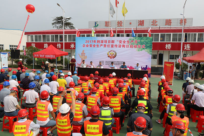 盛夏六月,祥瑞钟聚。在全国第十六个安全生产月活动之际,路桥集团枣潜高速公路第四标段项目经理部在荆潜项目群内主办"企业安全生产主体责任宣传咨询日"活动,紧紧围绕"全面落实企业安全生产主体责任"这一主题,全面提升建设单位、监理单位、施工单位安全意识和主体责任。参加此次活动的有荆潜高速建设指挥部蹇元平(指挥长)、王寿治、黄志刚、马明(副指挥长)、湖北省路桥集团有限公司刘祖雄(党委副书记、纪委书记、副总经理)及钟祥市安监局、荆潜项目群所有监理单位和施工单位。