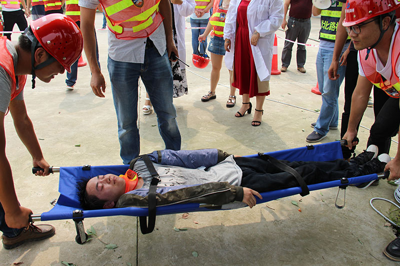 演练进行中 "伤员"被抬上担架
