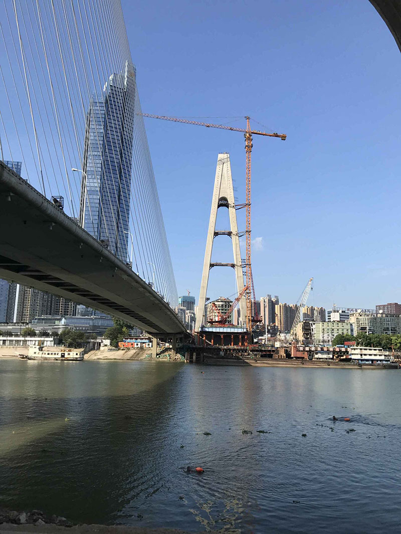 江汉四桥主桥为独塔斜拉桥,塔高114.5米,主跨232m为钢混结合梁,主桥钢梁共分28个节段采取逐节拼装跨越汉江。每节段由钢主梁、斜拉索和桥面板组合而成。