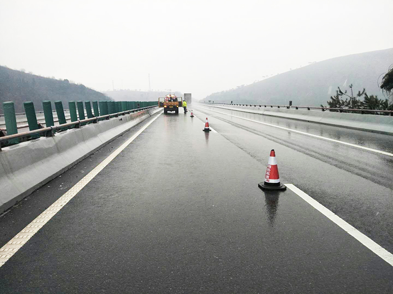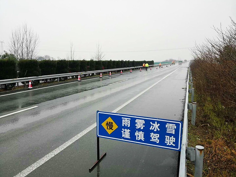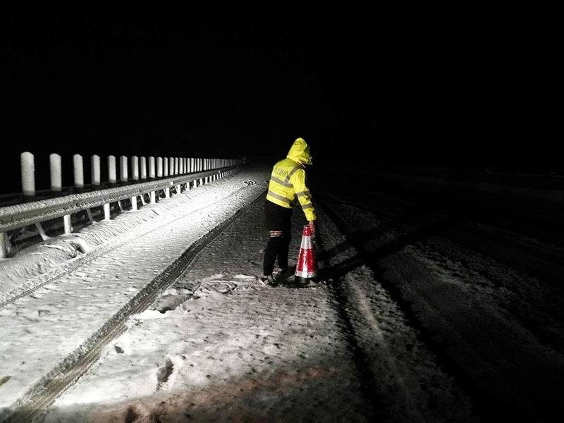 为了保障高速路面行车安全,交通设施完善,一大早项目部员工就去高速路上巡查,在风雪交加的路上将锥筒、标志牌等交通安全设施摆放整齐。尽管寒风凛冽,但作为随岳人却不畏严寒,为了除雪保畅后续工作的顺利进行,依然兢兢业业检查路面结冰和气温情况。