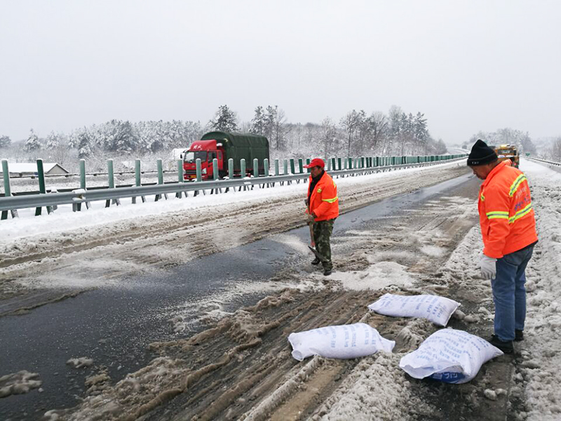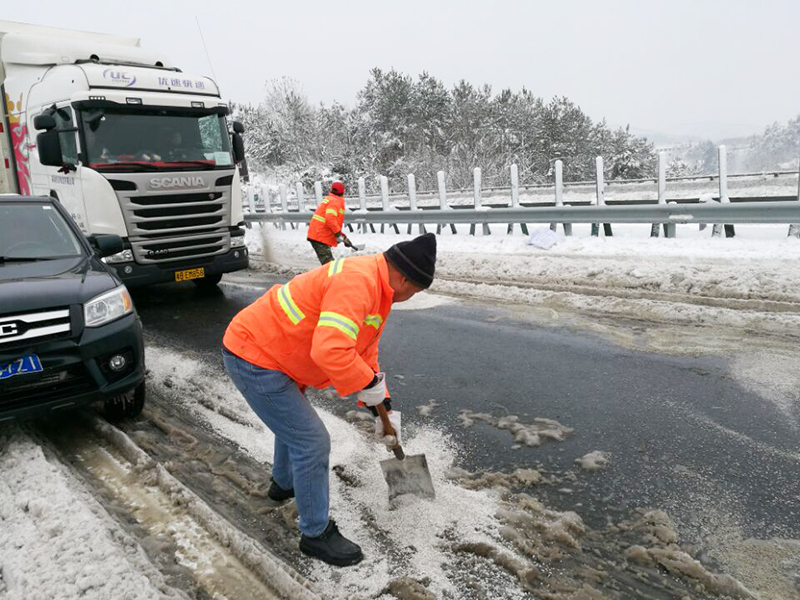 2018年1月3日,气温突降,路面有结冰现象。上午随岳境内逐渐开始降雪,随岳养护2标在养护站、路政、交警的积极配合下,立即启动除雪防滑应急预案,全面开启"防冻模式"迎战冰雪天气。一起监控车辆通行态势,一起应对车流高峰压力,合力抗击这次的冰雪恶劣天气,以实际行动谱写了一曲动人心弦的上下同心、全力以赴抗雪防冻、救灾保畅之歌。