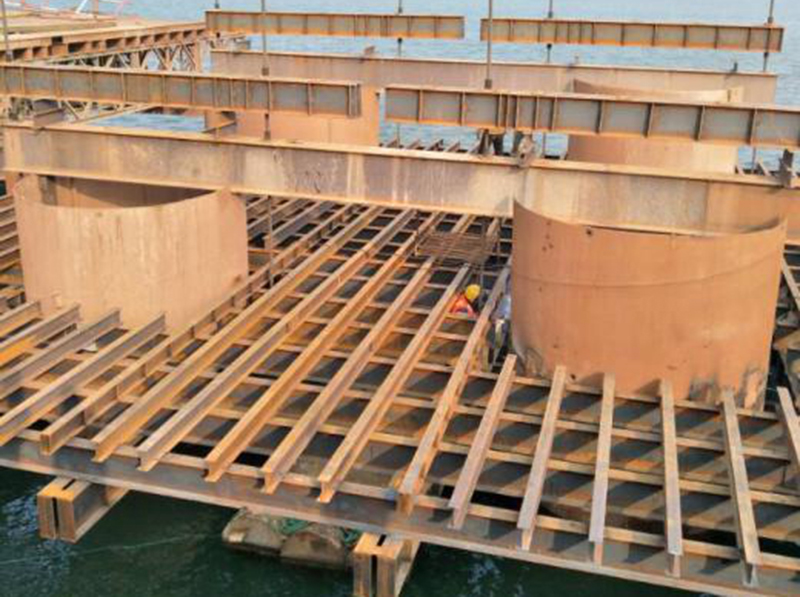 为确保双壁吊箱围堰套箱成功下放,项目部精心谋划,科学组织,多次召开专题方案研讨会,对施工方案、操作规程、施工过程中应急处置方案等做了详细安排;同时,本着"宁为安全受累,不为事故流泪"的原则,从陆地平台两层套箱试拼到底板安装试下放,对现场作业人员进行专业技术培训和现场演练。历时两个月,最终安全有序将五层套箱按设计要求下放至控制点。