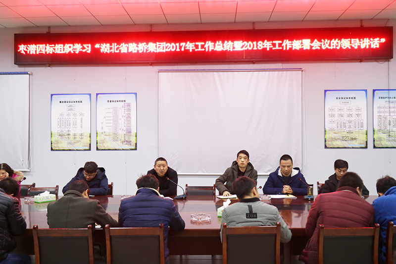 2018年2月24日,枣潜四标在项目部会议室组织学习了"湖北省路桥集团2017年工作总结暨2018年工作部署会议上的领导讲话",会议由项目副经理徐志伟主持,项目全体员工参加了会议。