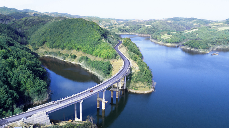 丹江口市环库公路江南段全长32公里,连接3个镇(办、区)13个贫困村。该路二期工程起于三官殿办事处阳西沟大桥,经牛河林区,经牛河林区、千岛画廊景区、龙山镇止于龙山镇龙山村与枫土路相接,全长24公里,其中桥梁19座,共计2981延米,隧道一座全长300延米,二级公路标准,宽8.5米,设计时速40公里/小时。