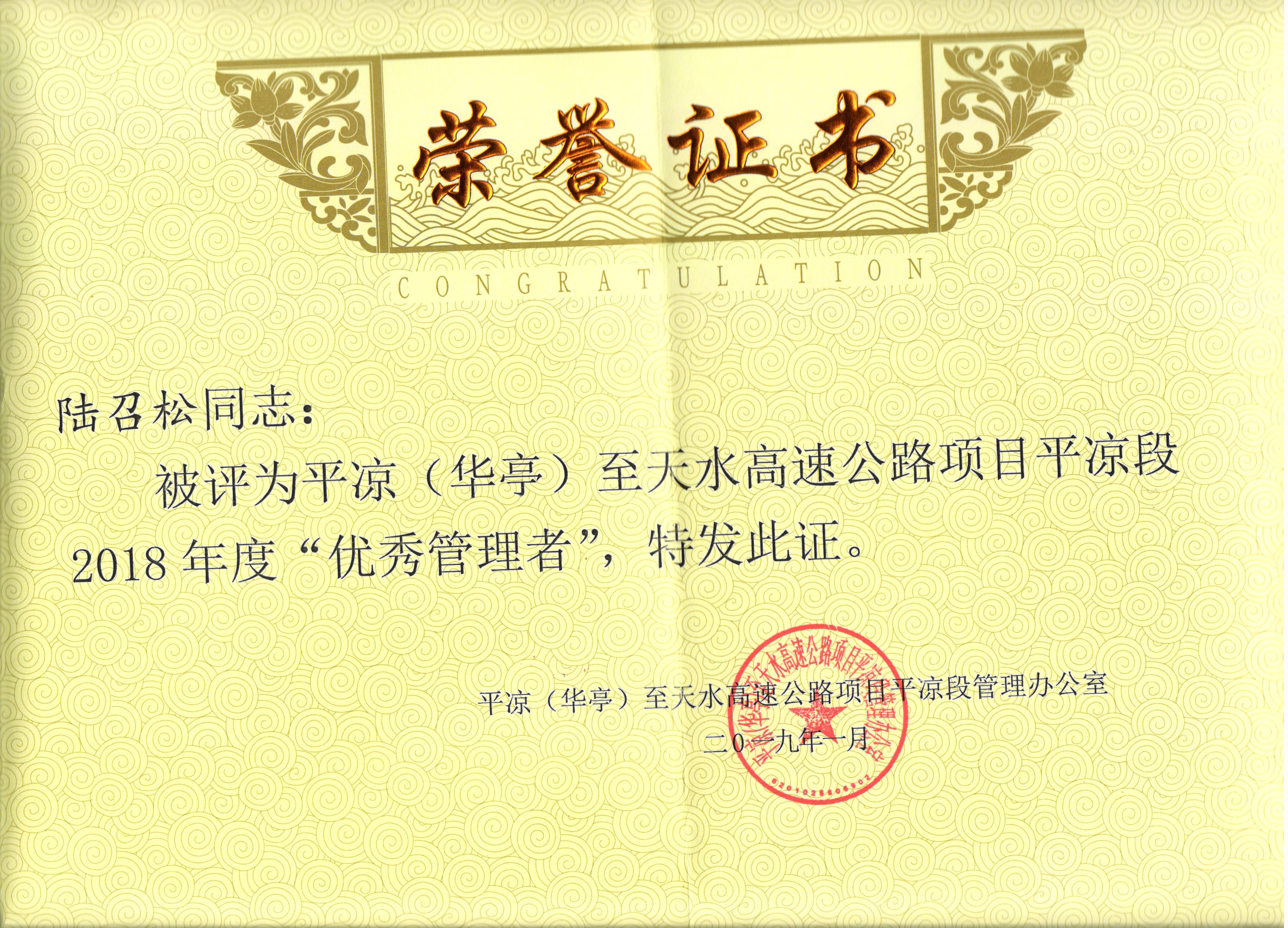 在2018年12月30日召开的平凉(华亭)至天水高速公路项目平凉段管理办公室召开平天高速平凉段、泾华项目2018年工作总结暨2019年工作部署会上,项目办对路桥集团平凉(华亭)至天水高速公路项目PT4标项目经理部2018年的工作给予充分肯定,特授予陆召松同志平天高速平凉段2018年“优秀管理者”称号;2018年11月29日,大房李家抗滑桩工程完工,项目办给予我项目部30万元人民币奖励。