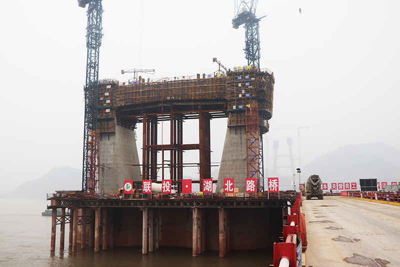 在下横梁施工过程中,大桥作业人员共安装钢模板35吨,绑扎钢筋130吨,安装木质内模820平方米,在下横梁内部铺设预应力管道56束,管道内的钢绞线通过预应力张拉,提高了下横梁的抗弯能力和刚度,使其得以承受巨大荷载,为下阶段上塔柱施工奠定坚实的基础。