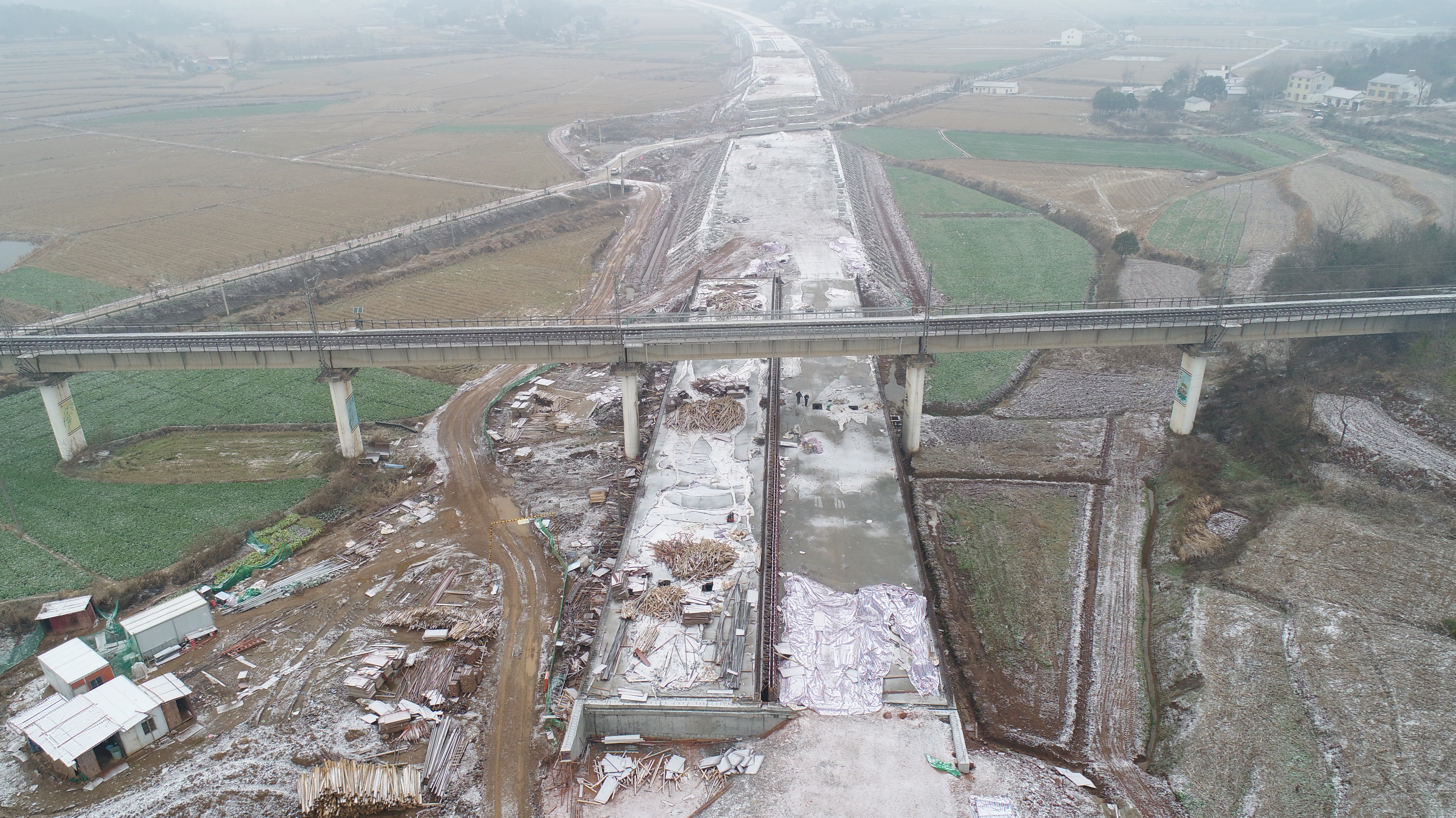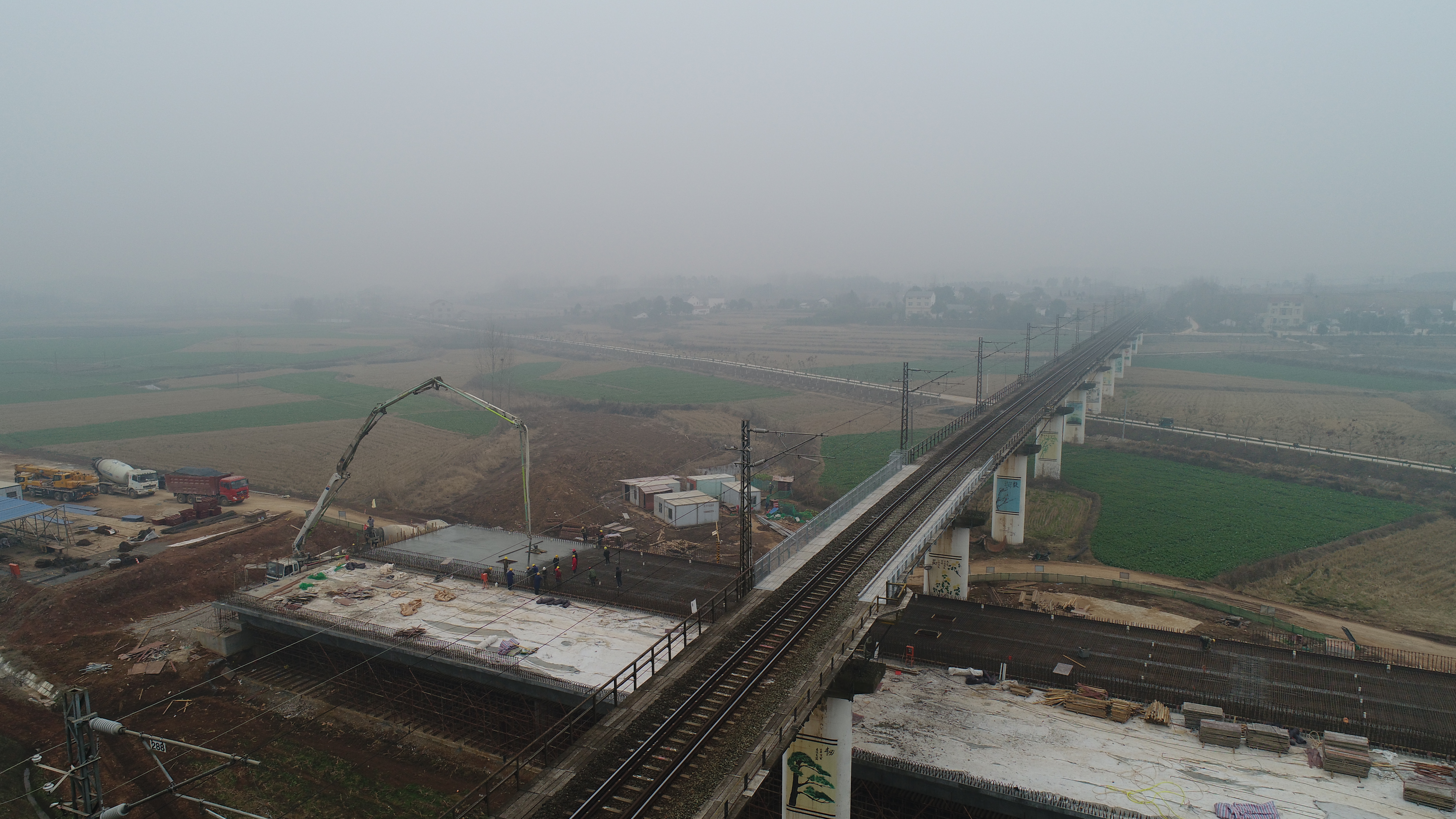主线下穿长荆铁路桥为湖北省内首座由高速公路承包单位报建的工程,涉及铁路的施工手续办理复杂,需与铁路局各部门及沿线桥工段沟通、协商,签订安全保证协议书;桥下施工空间较小,桥址处为水田及鱼塘,满堂支架搭设前需对地基进行处理;旁边铁路高压线横穿桥梁,大型机械设备工作面狭小。