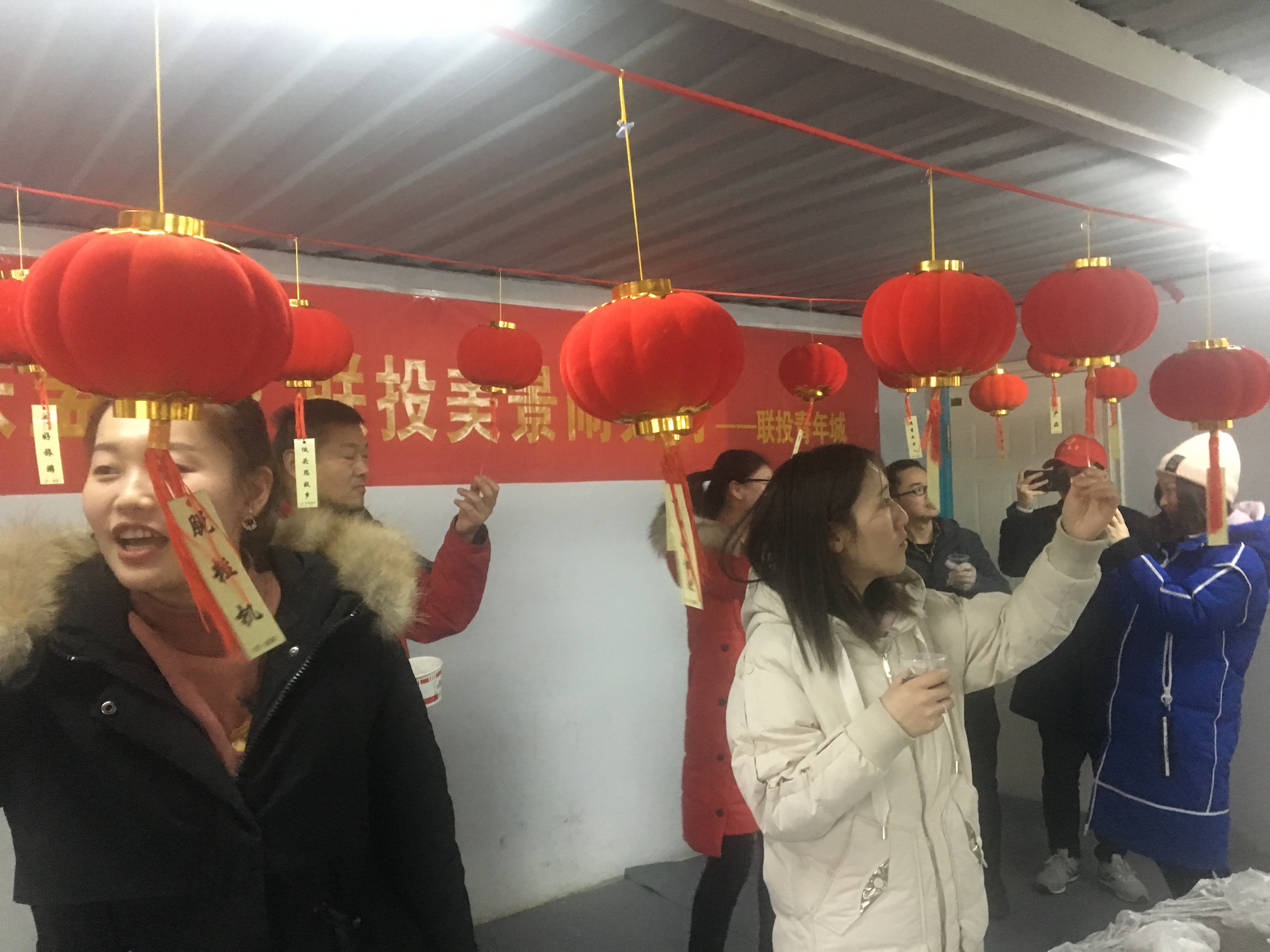 现场喜庆的红灯笼下悬挂着几十条妙趣横生的灯谜,员工们都踊跃参与,有独立思考的,也有三五成群结伴猜谜的,画面其乐融融。