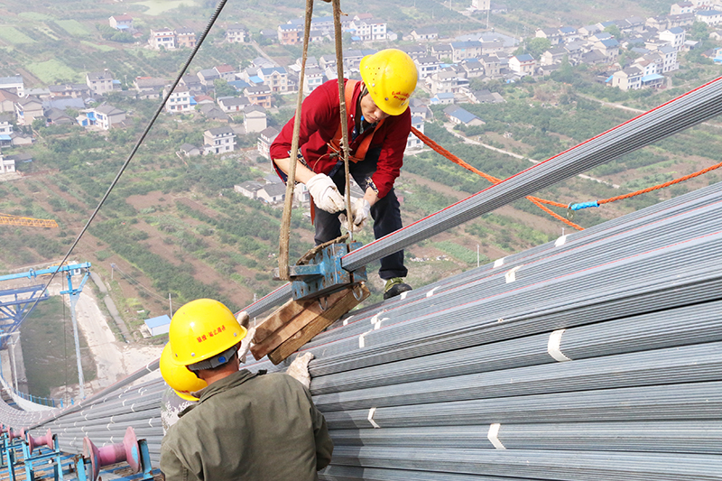 根据施工需要,主缆施工实行两班倒,白班进行索股牵引,夜班进行索股调整。自2019年2月19日架设试验索以来,项目部100余名建设者们共同努力,调索技术员长达50余天的时间内“昼伏夜出”,克服夜间低温、强风等不利因素,避开大雨、雷暴等一系列不利天气影响,抢抓晴好天气,不断往返于猫道之上。高峰期每天架设达12根索股,展现了白洋桥的建设速度。正是有了他们的艰苦奋斗和默契配合,才换来今天架设工作优质高效的完成。