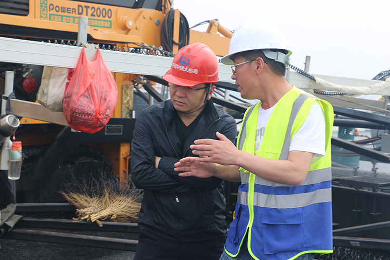 观摩团参观了摊铺施工现场,并就现场施工温控、路面平整度控制、防水新工艺、桥面排水新方法、施工接缝等问题与南四环项目进行了深入探讨与交流;同时重点观摩了DT2000中大摊铺机,对这台“摊铺新星”表现出浓厚兴趣。