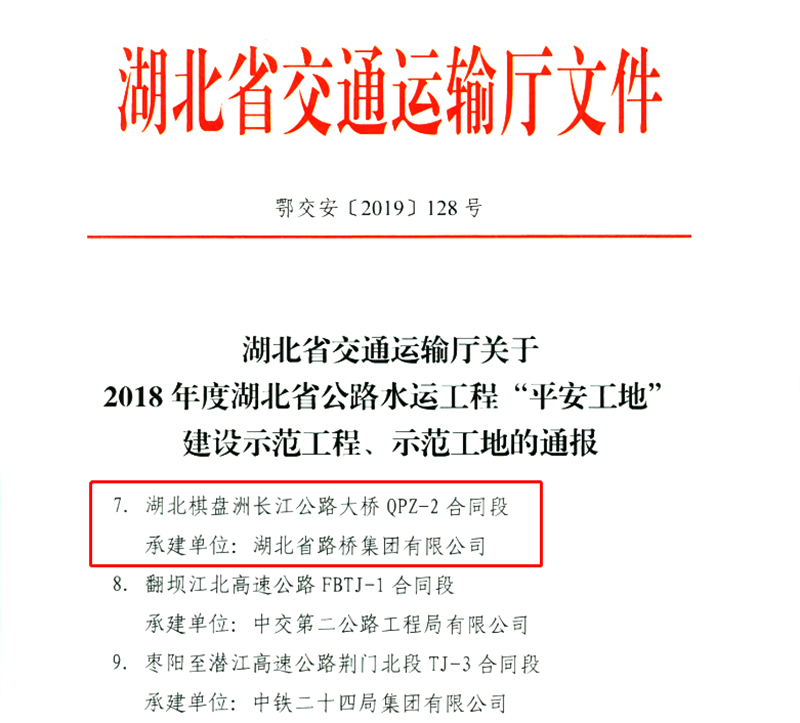 近日,从湖北省交通运输厅传来喜讯,由湖北省路桥集团有限公司承建的棋盘洲长江公路大桥QPZ-2标项目荣获“2018年度湖北省公路水运工程‘平安工地’建设示范工地”称号。