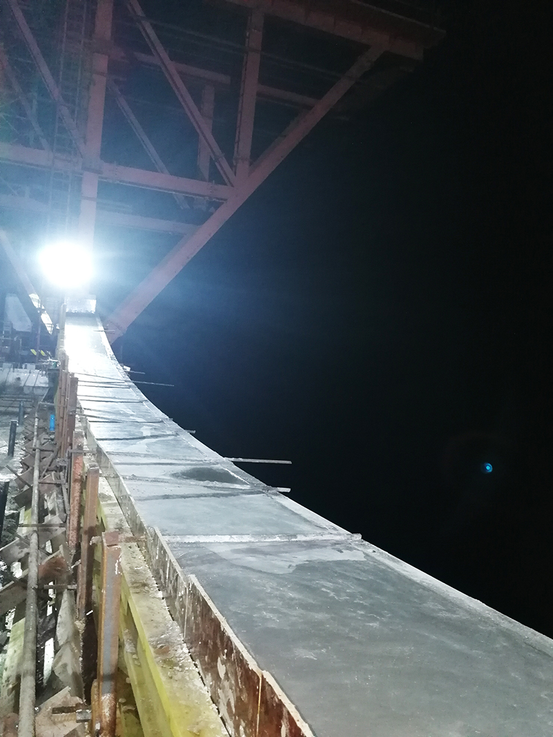 自2018年11月完成南主塔封顶之后,项目部再接再厉,继续抢抓施工进度,全力推进上横梁结构施工。按照施工计划,上横梁分为四层浇筑,此次浇筑的是上横梁第四层混凝土,前三层分别于3月17日、3月26日和4月13日浇筑完成。为防止支架重心偏移,浇筑时采用两段对称浇筑施工,并全程进行测量监控,确保质量优良。