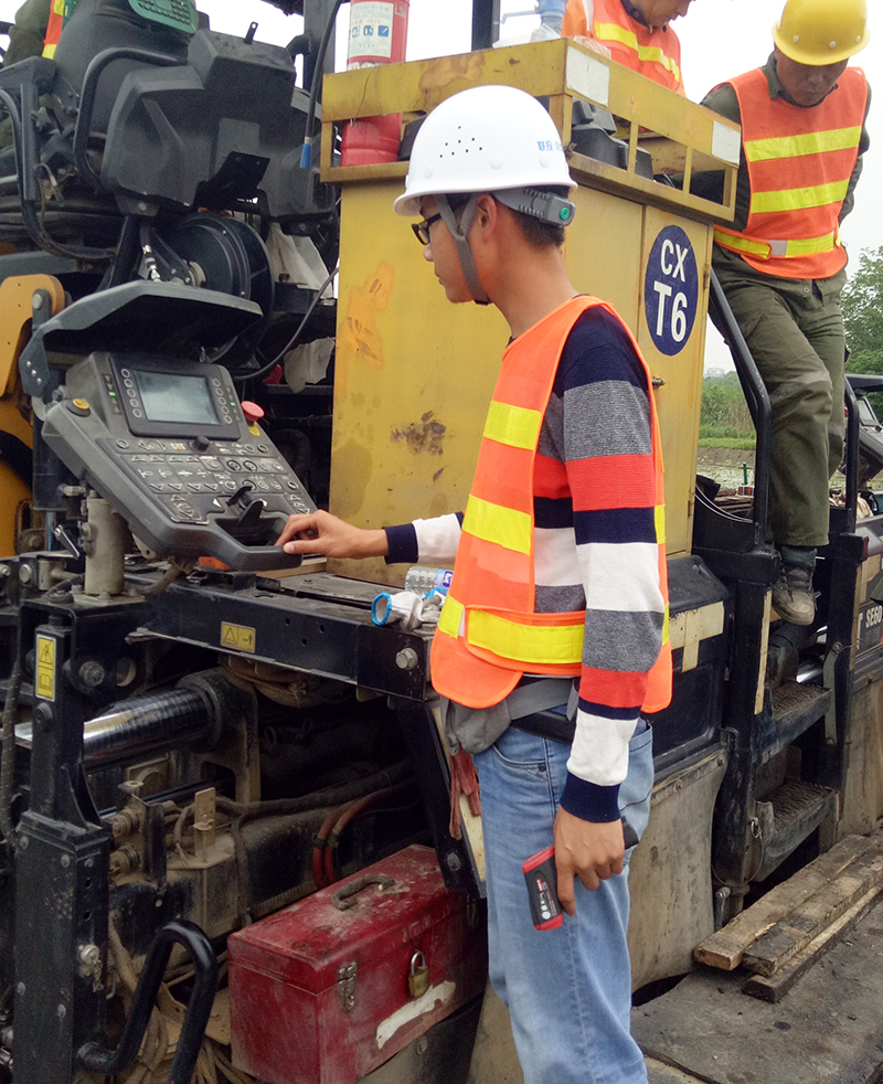 图:项目部青年正在调试作业中的摊铺机