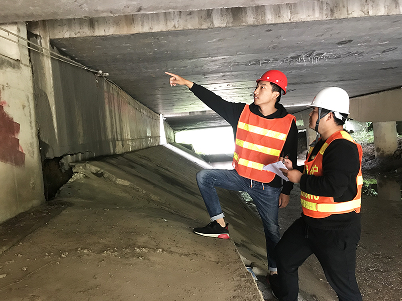 图:项目部的青年们认真检查桥梁病害处