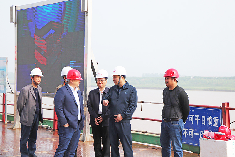 图:李新桥(右二)在武穴长江大桥主桥施工平台实地考察