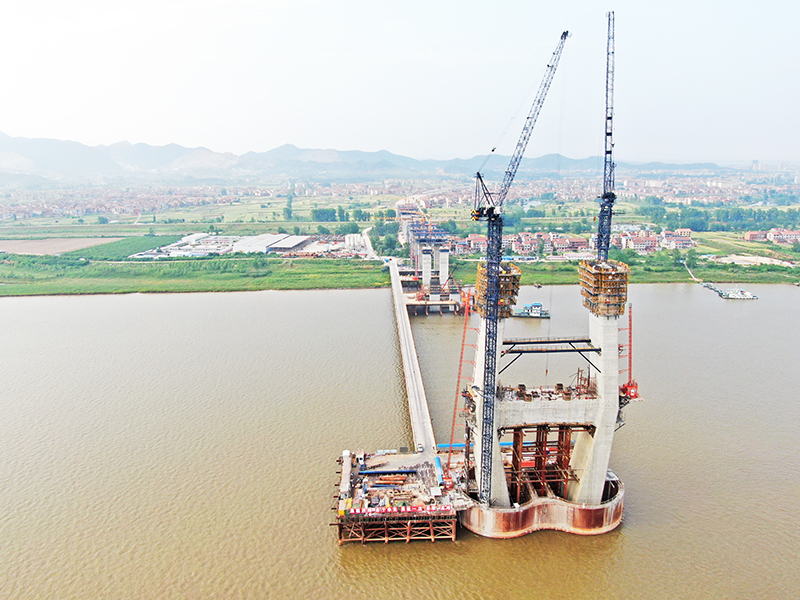 图:武穴长江主塔正在进行爬模施工