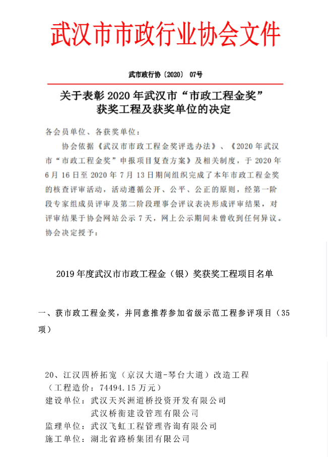 近日,武汉市市政行业协会发布《关于表彰2020年武汉市“市政工程金奖”获奖工程及获奖单位的决定》,由湖北省路桥集团有限公司承建的江汉四桥拓宽(京汉大道-琴台大道)改造工程榜上有名,荣获2019年武汉市市政工程金奖,并被择优推荐参加“湖北省市政示范工程”评选。