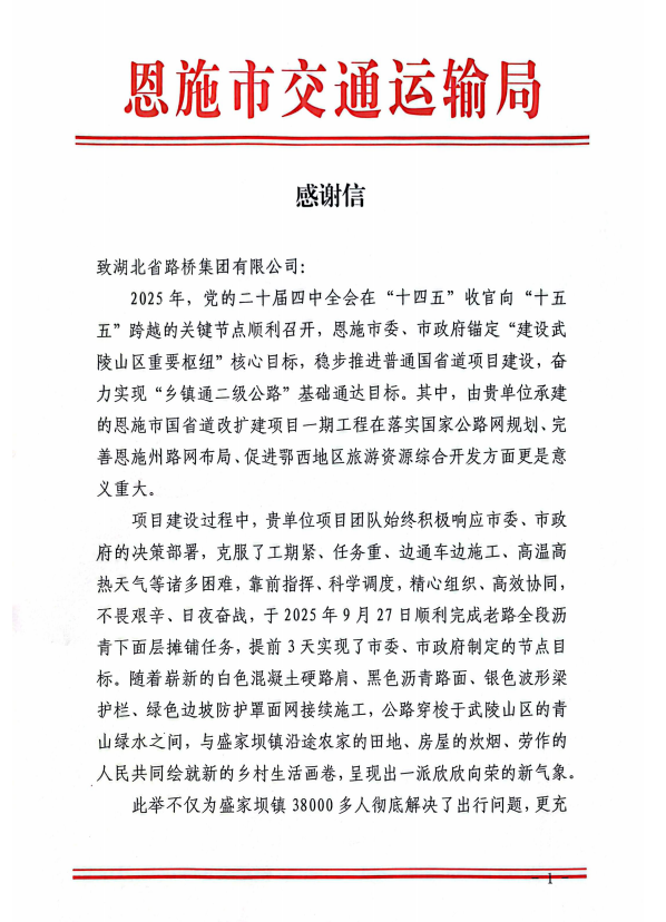 近日,湖北路桥恩施市国省道改扩建项目收到来自恩施市交通运输局的感谢信。信中对项目团队提前、优质完成关键节点目标表示高度赞扬与衷心感谢,充分肯定项目团队在服务地方交通建设、促进区域发展中所展现的责任担当与专业能力。