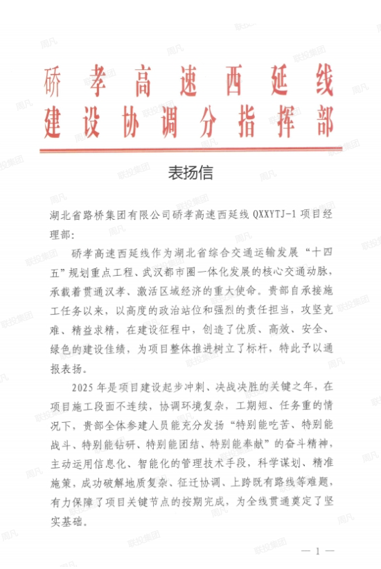 硚孝高速西延线建设协调分指挥部向湖北路桥硚孝高速西延线QXXYTJ-1项目经理部发来表扬信,对该项目部在建设中所取得的突出成绩予以高度肯定。