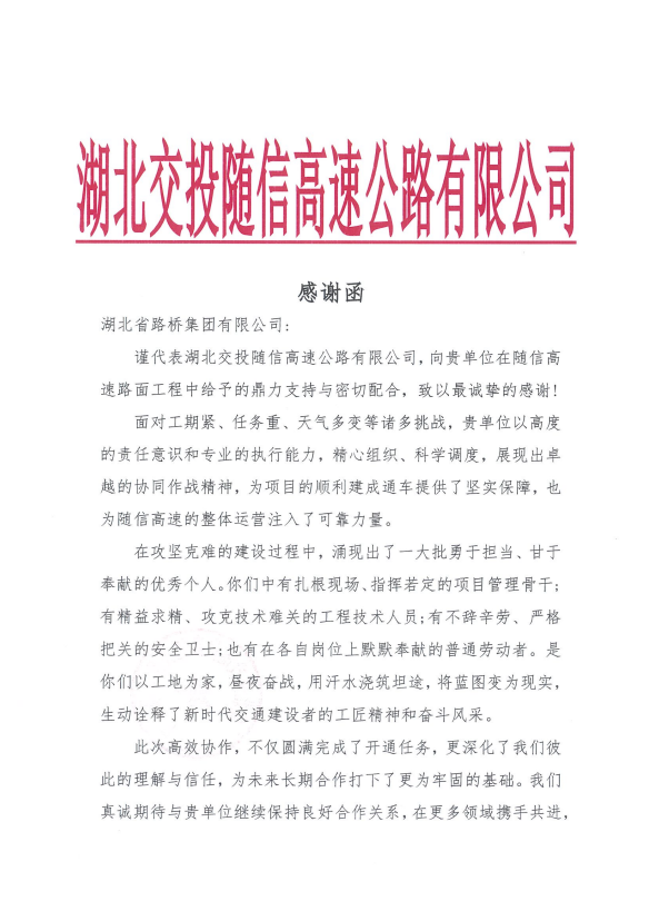 随信路面项目收到项目办发来的感谢函。该项目是湖北省综合交通运输发展“十四五”规划中的重点工程。自项目建设以来,面对工期紧、任务重、天气多变等诸多挑战,随信路面项目团队以高度责任与使命担当为引领,精密组织、科学调动,严守质量安全底线,圆满实现全长45公里沥青路面全线贯通,为区域交通网络完善及沿线经济社会发展注入路桥力量!