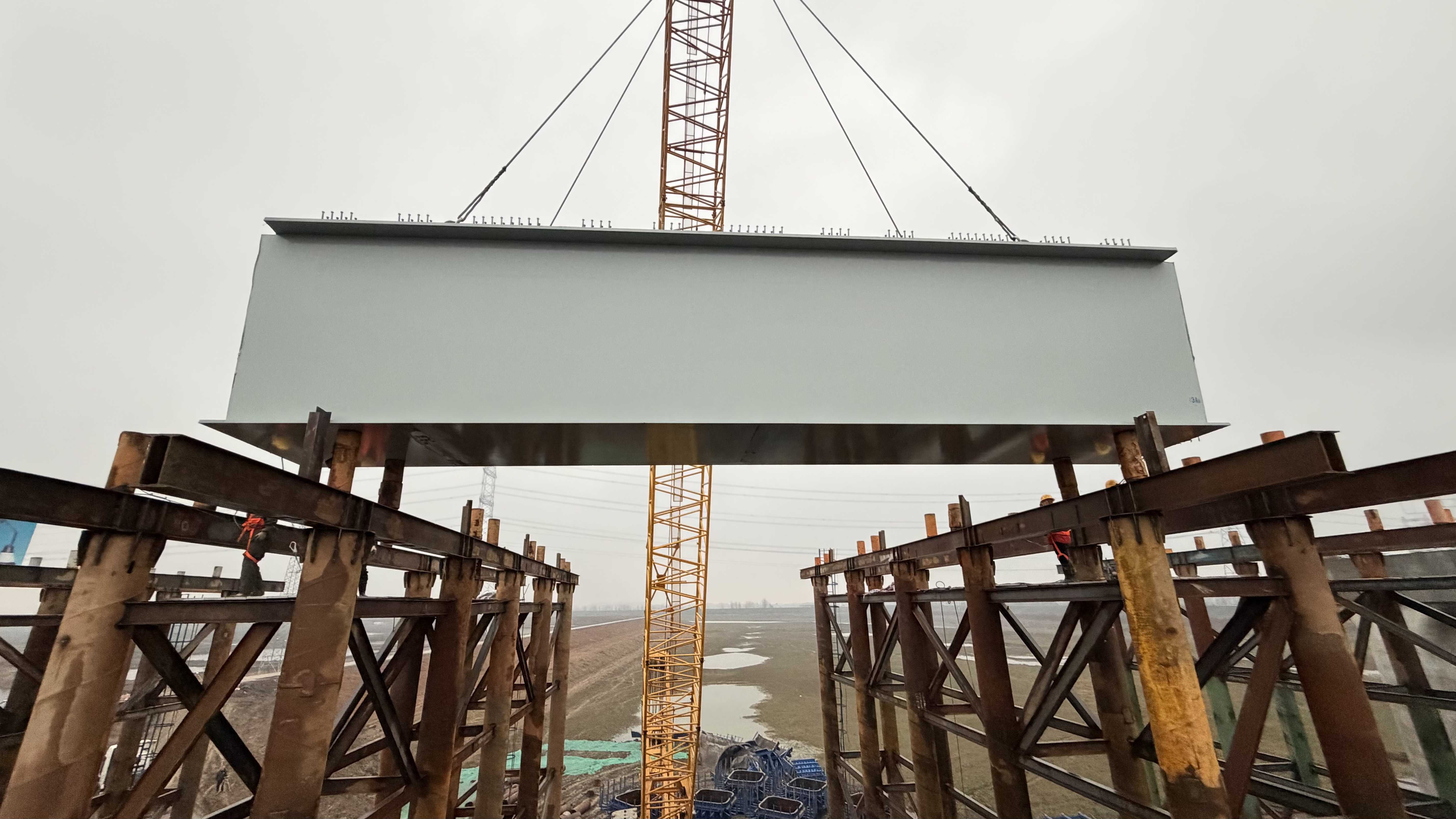 2月6日,随着架梁吊机将首节钢箱梁精准吊装到位,黄黄改扩建三标蕲河特大桥上部结构施工正式拉开序幕。